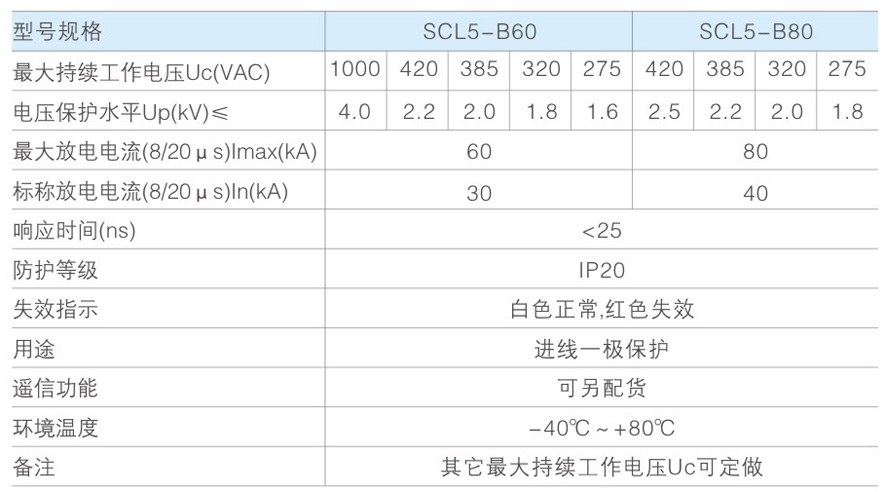 SCL5-B系列电涌保护器(以下简称SPD)适用于低压交流配电系流的IT. TT. TN-C、TN-S.TN-C-S等供电系统,对间接雷电和直接雷电或其他瞬时过电压的电涌进行保护。依据IEC61643-1:1998 -02标准的第1 级电涌保护器。B类电涌保护器,SPD具有共模(MC)和差模(MD)保护方式。产品符合18802.1和IEC61643-1等标准。