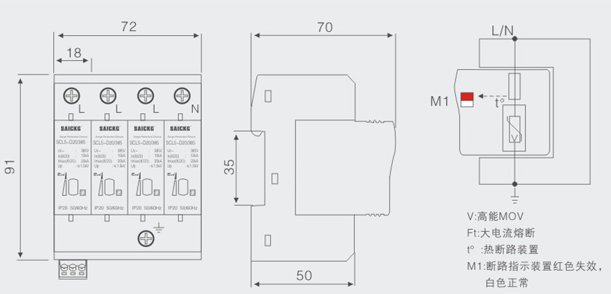 . SPD内置脱离器。当SPD因过热、击穿失效时,脱离器能自动的将其电网.上脱离,同时给出指示信号。SPD正常工作时可视窗口显示白色,失效脱离后显示红色。