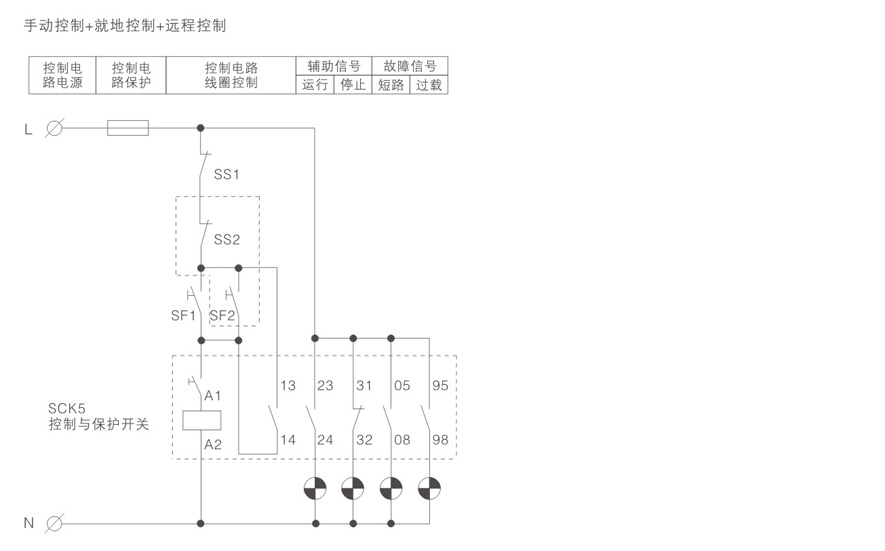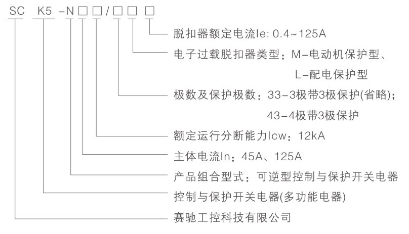 SCK5采用模块化的单一产品结构型式,集成了传统的断路器(熔断器)、接触器、过载(或过流、断相)保护继电器、起动器、隔离器、电机综合保护器等低压电器产品的主要功能,具有远距离自动控制和就地直接人力控制功能,具有面板指示及机电信号报警功能,具有过压欠压保护功能,具有断相缺相保护功能,具有协调配合的时间-电流保护特性(具有过载反时限、定时限、短路瞬时、特大短路瞬时四段保护特性)。根据需要选配功能模块或附件,即可实现对各类电动机负载、配电负载的控制与保护。