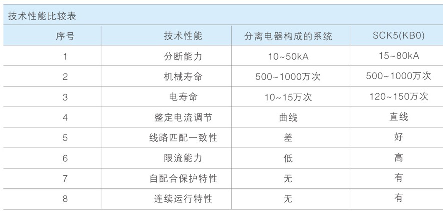 SCK5系列控制与保护开关电器的出现从根本上解决了传统的采用分立元器件(通常是断路器或熔断器+接触器+过载继电器)又有选择不合理而引起的控制和保护配合不合理的种种问题,特别是克服了由于采用不同考核标准的电器产品之间组合在一起时,保护特性与控制特性配合不协调的现象,极大地提高了控制与保护系统的运行可靠性和连续运行性能。