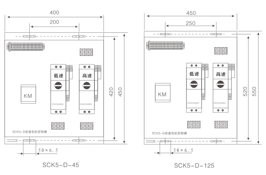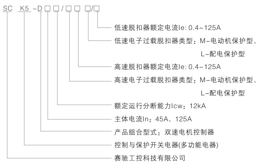 以数字化产品SCK5作为主开关,集成熔断器、断路器、接触器、起动器、隔离器、热继电器、过载(或过流、断相)保护继电器、电机综合保护器、智能漏电继电器等低压电器产品功能于一体,与相应的接触器及其他必需的附件,通过机械联锁和电气联锁构成新型保护式SCK5- D双速电机控制与保护开关电器,实现集成化的、内部协调配合的双速电机自动控制与各种保护功能,适用于双速电动机的起动控制与保护。具有星三角减压起动器SCK5-J.自藕减压起动器SCK5- Z同样的特点。产品根据需要安装电气联锁,具有可靠性高、分断能力高、寿命指标高,体积小、安装面积小、安装维护工作量小等优点。