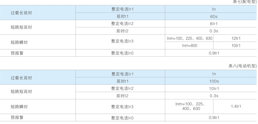 如用户订货时无特殊要求,脱扣器特性参数按表七、表八配置