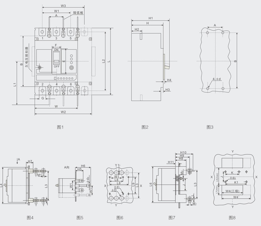 注:图1、2. 3为板前接线及安装开孔尺寸;图4、5. 6为板后接线安装及开孔尺寸;图7、8为插入式接线安装及开孔尺寸。