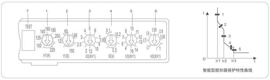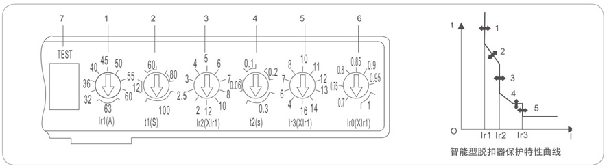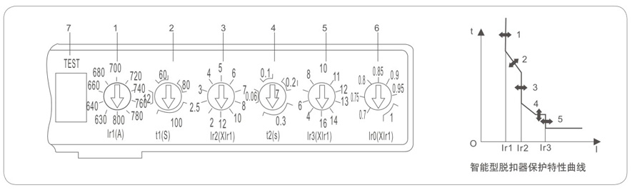 1、过载长延时动作电流Ir1调整,根据断路器不同的额定电流,可从4点到10点进行调整;