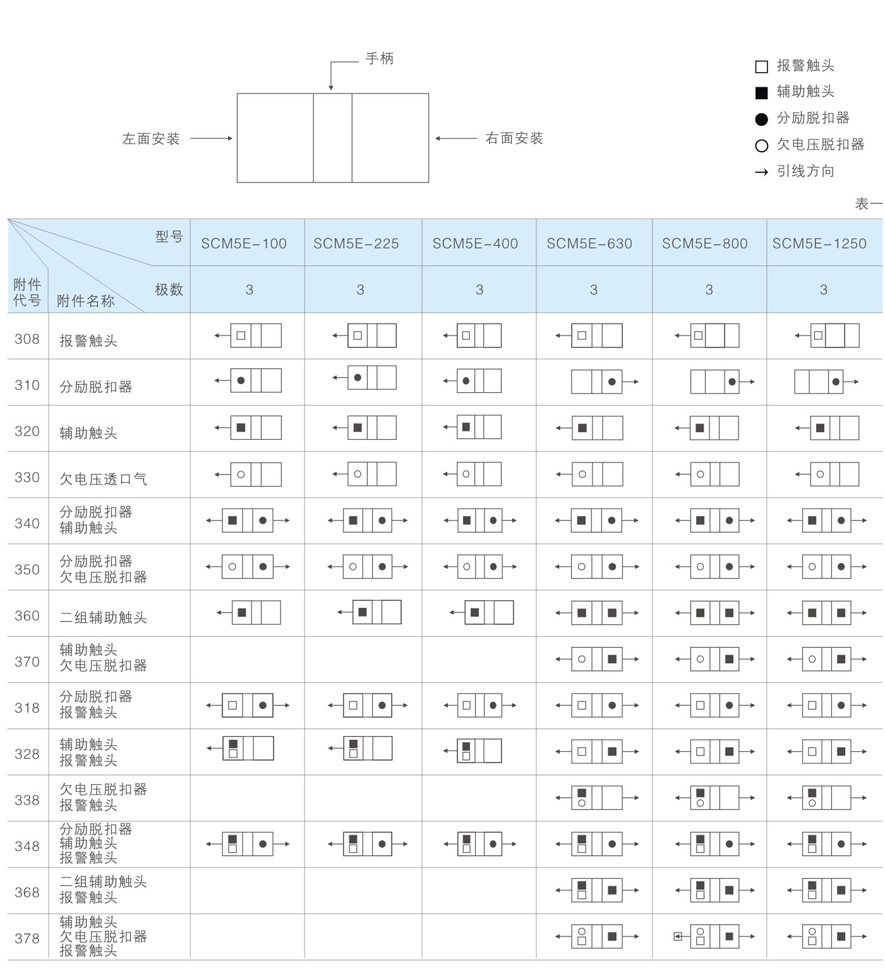 b. SCM5E - 630及SCM5E- 800中348规格辅助触头为-对触头(即一常开,-常闭),368规格辅助触头为三对触头(即三常开,三常闭)。