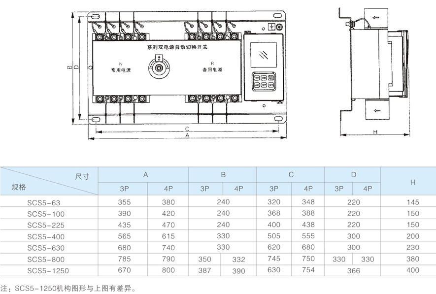 SCS5系列智能型双电源自动切换开关是由两台三极或四极的塑壳断路器及其附件( 辅助、报警触点)、机械联锁传动机构、智能控制器等组成。分为整体式分体式两种结构。整体式是控制器和执行机构同装在一个底座上;分体式是控制器装在柜体面板上,执行机构装在底座.上由用户安装在柜体内,控制器与执行机构用约2M长的信号连接。