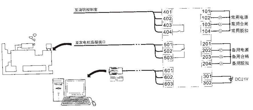●401~404消防联动控制端口;该接口用于在消防设备报警后远程控制本开关切断电源。401、402--消防联动控制信号输入端、该接口外部只能接一组常开无源触点(若消防设备送出信号为有源信号时,必须先通过一个小型继电器转接后再将继电器常开触点接入控制器,否则会烧毁控制器),当外部触点闭合后控制器立即控制开关转换到分闸位置切断负载电源,同时通过403和404端子返回一个信号到消防控制中心; 403、 404--内部为-组常开继电器干节点,用于消防动作返回信号之用;端子在正常的时候为常开,当有消防信号送入控制器且开关转换到分闸位置时403和404接通。(注:当消防联动功能启动后自动转换开关将停止工作,若要使开关再正常转换,必须先撤除消防信号再按下控制面板上的任意键后开关即可恢复正常转换)