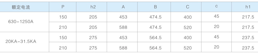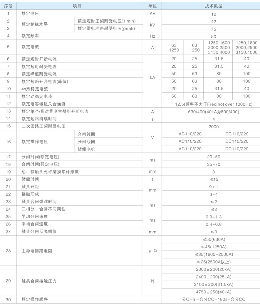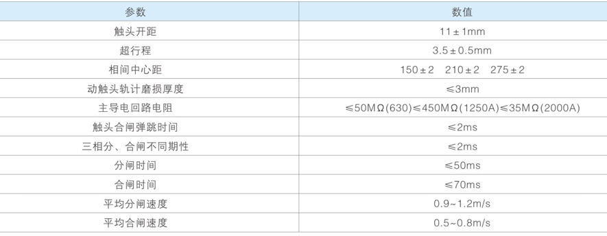 - 回路电阻小:额定触头压力下In= 1250A时,R=9土1μ 2; In=3150A时; R=7+1μ 2;