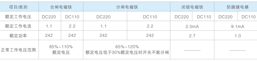 合、分闸电磁铁及相关电气元件技术参数: