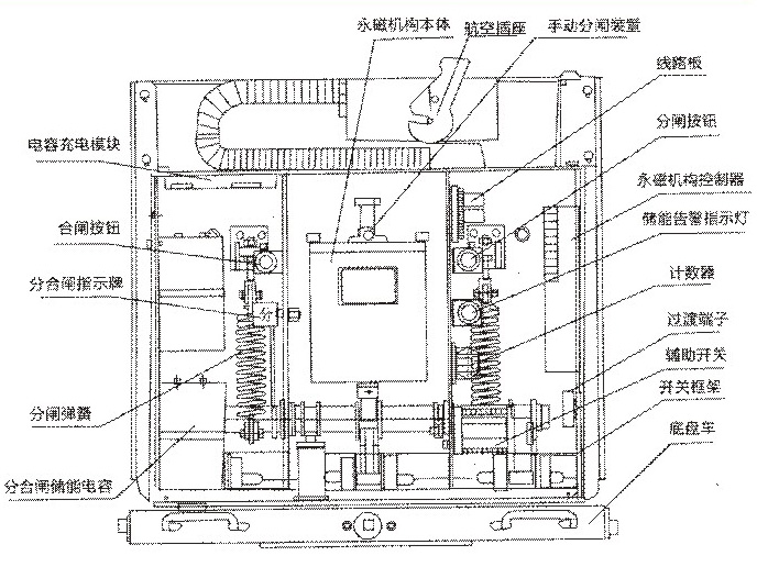 SCV5-12YG型户内交流高压真空断路器时采用永磁机构和真空灭弧室前后布置的形式。主导电回路部分为三相落地式结构。该断路器将灭弧室、上、下出线座安装在绝缘简内,因而爬电性能强,这种结构设计。极大地减少了粉尘在灭弧室表面的聚积,同时还可防止真空灭弧室受到外部意外因素的损坏,在湿热场合及严重污秽环境下,亦可对电压效应呈现出高阻态。根据不同的使用场所,可在绝缘筒上增装-上防尘盖(作为附加装置),这种设计有助于防止闪络的发生。由于该断路器采用永磁机构,因此传动环节少,寿命长,可靠性高,噪音低,无污染,无爆炸危险等优点,并且适用于频繁操作和工作条件比较苛刻的场所,能真正实现免维护。该断路器总体结构如图。